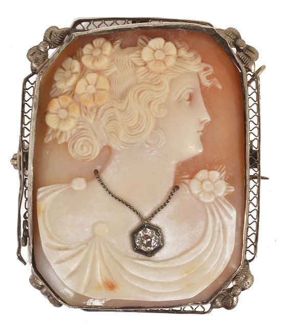 A large Art Deco carved shell cameo portrait brooch of a classical lady in profile, around her neck a single stone diamond set pendant on chain. White metal fancy mount, a.f. Unmarked. length 4.7cmCondition: Top right corner cracks to cameo, barely visible to front. Mount damaged