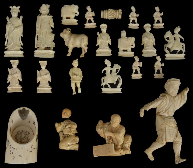 An early 20th century Chinese carved ivory part chess set together with various other pieces of early 20th century Chinese carved ivory, including three figures, and a pocket watch stand. Condition: Various amounts of damage and losses throughout. First hand inspection suggested.