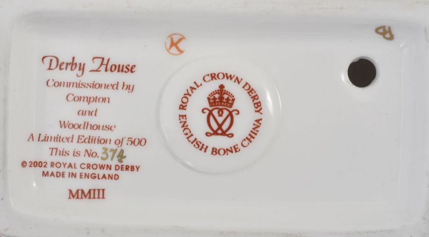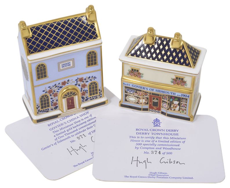 Two limited edition Royal Crown Derby houses 'Govier's China Shop' number 971/1000 and 'Derby Townhouse' number 374/500, both with certificates. Condition: Good condition.