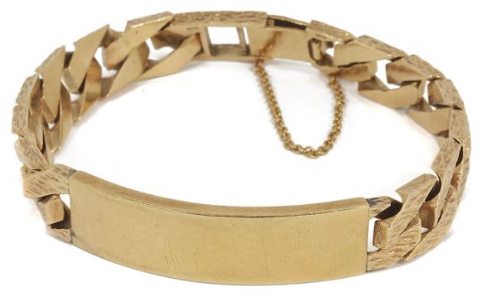 A heavy 9ct gold gentleman's Identity bracelet of flat curb link design with bark effect finish. Weight approx .61 gms.Condition: Name plate not engraved
