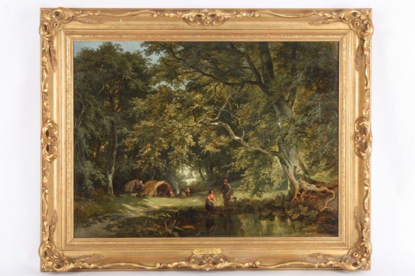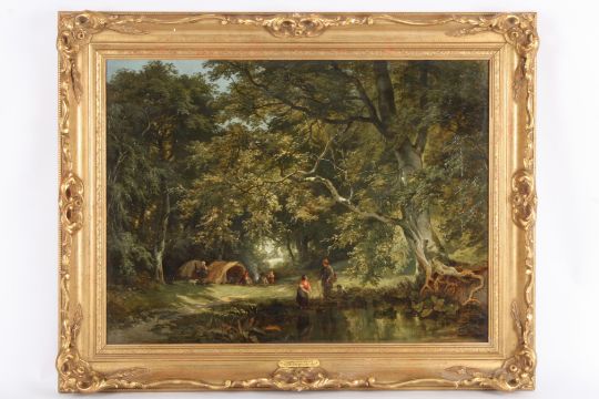 After Henry John Boddington (1811-1865) British 'A Gypsy Encampment', a peaceful wooded scene with travellers at a campsite, a man and woman by the water in the foreground. Oil on canvas, unsigned, in a gilt gesso frame. 44 x 54 cm.Condition: Good condition, cleaned and relined, some crazing.