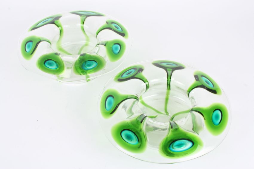 A pair of Stuart glass peacock bowls of shallow form with wide flared necks decorated with green and blue glass peacock feathers and a circular foot. 29.5 cm diameter.Condition: Good condition.