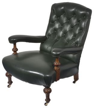 A Victorian oak button back library armchair, with dark green leather upholstered back, seat and arms and supported on short turned legs to castors. height 91cm, 70cm width., 98cm depthCondition: Recovered to a high standard, in good overall condition.