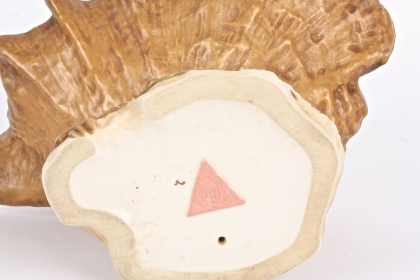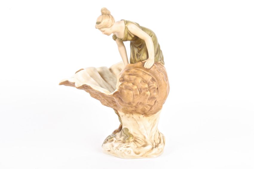 A Royal Dux bisque porcelain figure of a maiden atop a large conch shell realistically modelled, the base decorated with a crab and seaweed. Applied pink triangle mark to base. 27 cm wide.Condition: Excellent condition with no damage.
