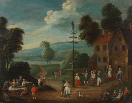 Late 18th century/early 19th century Continental School May Day, a festive scene of figures dancing, merrymaking and eating around a central May pole outside a tavern, oil on panel, signed indistinctly, framed. 30 x 38 cm.Condition: Good condition.