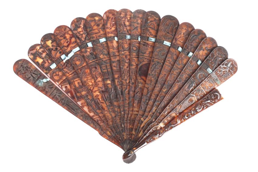 An early 20th century Chinese tortoiseshell fan finely decorated and pierced with scenes of figures, buildings, animals and trees. 18.5 cm long.Condition: Joining silks broken, one outer guard broken. Two inner sticks broken at stem.