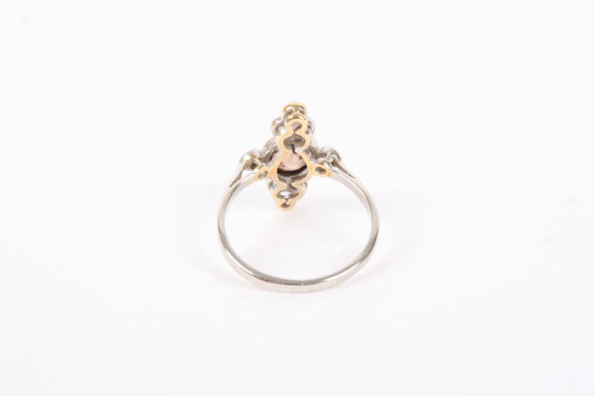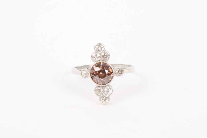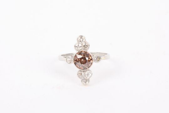 A delicate Art Deco fancy cinnamon coloured diamond ring, the cinnamon diamond approx. 1.00 ct. set within opposing diamond set trefoils and single diamonds to either side. Mount marked PLAT. Size L , Ring measures 2 cm top to bottom.Condition: Diamond has damage to one side, not visible to the naked eye, Some wear to mount