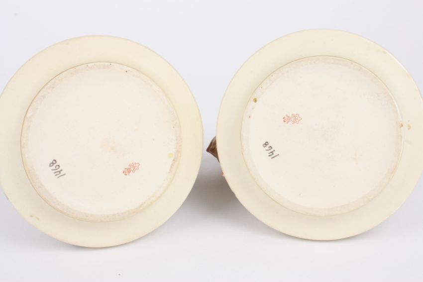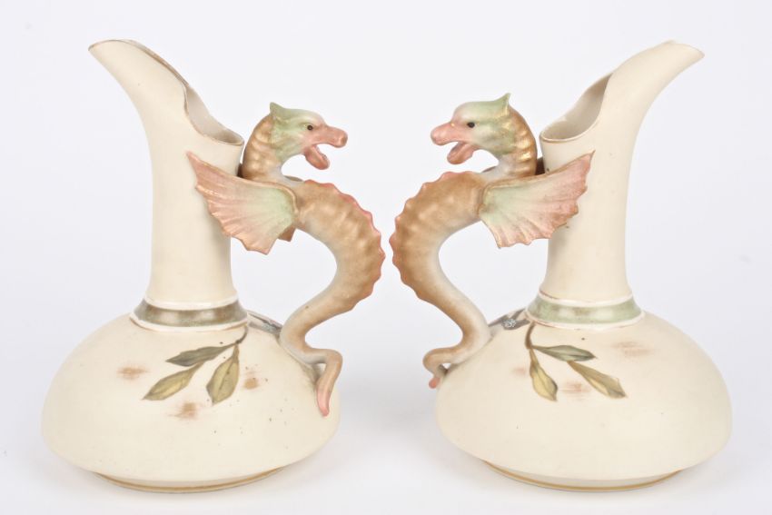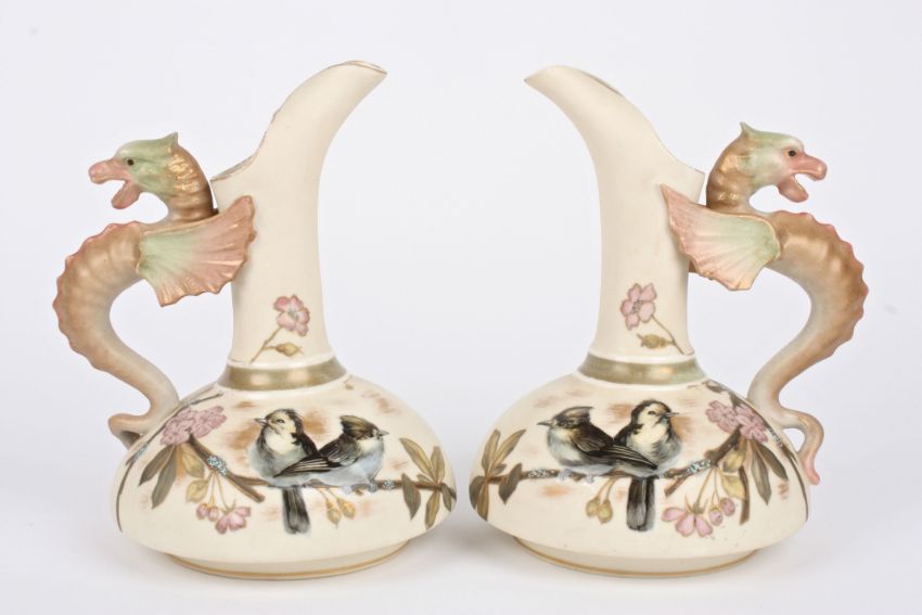 A pair of late 19th century Continental porcelain ewers painted with birds and flowers on an ivory ground, the handles formed as gryphons, marked in red to base. 20 cm high.Condition: Some light fritting and chipping to spout rim on both, some gilt wear in places.
