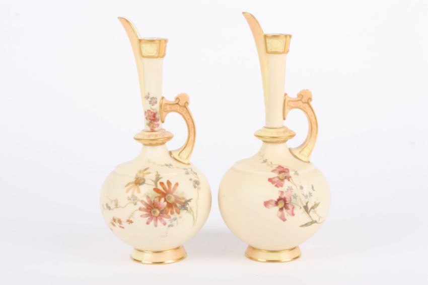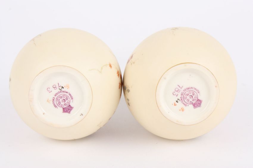 A pair of Royal Worcester ivory ground bottle jugs with slender necks and globular bodies, decorated with flowers, puce mark and numbered 783 to the base. 19 cm highCondition: Good condition.