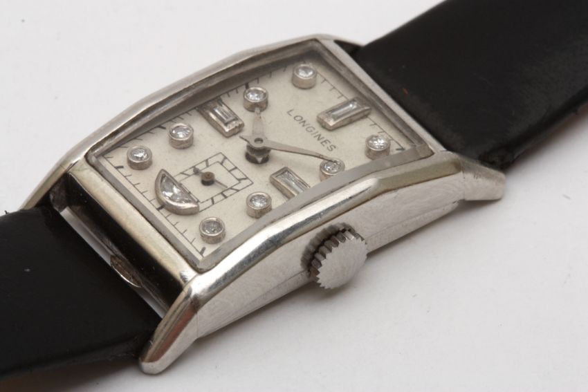 A 1940s Art Deco Longines platinum mechanical wrist watch c.1943/44 the rectangular silvered dial signed 'Longines' and with baguette and round cut baton markers, and subsidiary seconds dial, the 17 jewel hand wound cal. 9L movement signed numbered 6909917, in a tank style platinum case with curved lugs, on a black leather strap. Case 21mm wide.Condition: Generally in good working order, few small marks to dial and few marks to diamond mounts, case and glass in good condition. Appears to be running but stops after a few seconds so may need a service. It is possible that the diamond mounts are later editions.