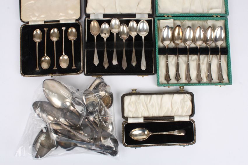 A collection of Georgian, Victorian and later hallmarked silver flatware including a pair of Georgian sugar nips, silver basting spoons, cased tea spoons, caddy spoons etc. Total weight 30oztCondition: Various condition, some tarnished and worn. One case set of spoons incomplete, another set of spoons with associated spoons and another case set with broken lid to case.