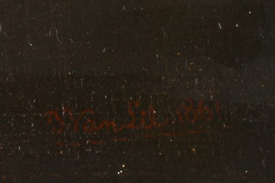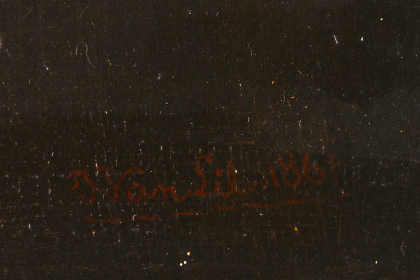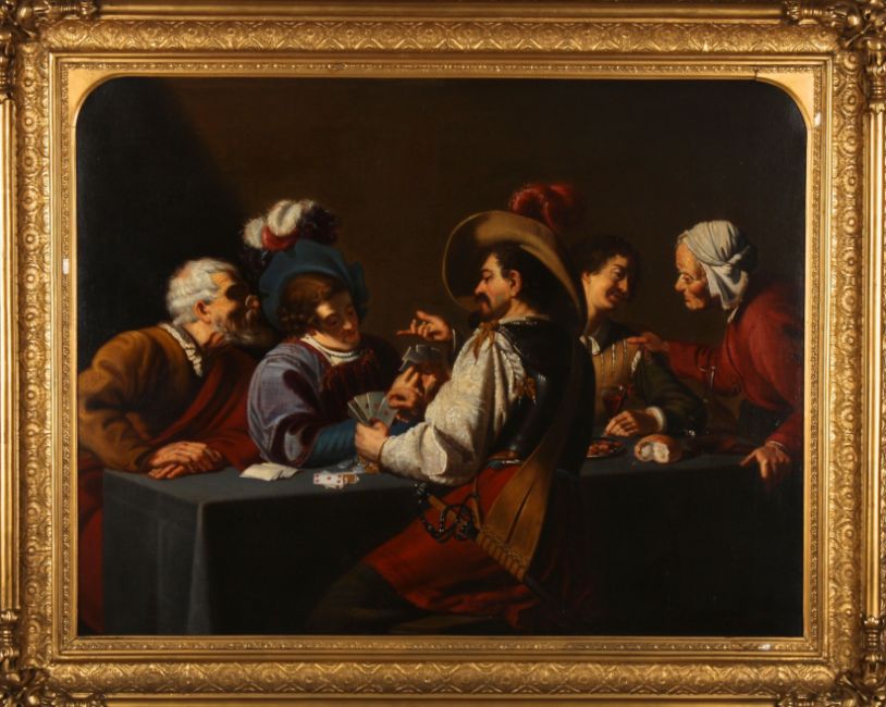 After Theodor Rombouts, 'The Card Players' by J. Van Sil (active mid 19th Century) large Dutch oil on canvas of two cavaliers betting at cards in company. signed in red lower right, ornate gilt gesso and wooden frame 53 x 69cm Condition: Relined and some restorationAnother painting by this artist can be found in the J.L.Kirk collection at the Wisbech & Fenland Museum. 'Descent from the Cross' after Peter Paul Rubens