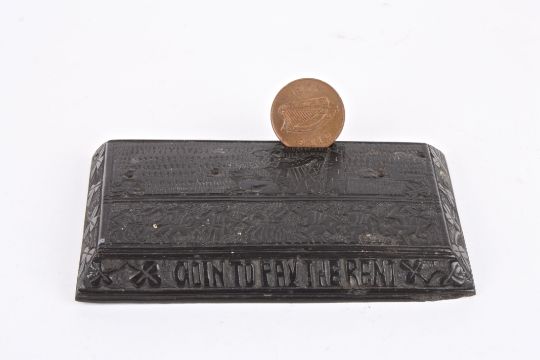 An unusual Irish carved oak coin stand 'Coin to Pay the Rent', carved with a harp, shamrocks and figures merrymaking. 12.25 cm wide.Condition: Couple of chips to corners.