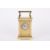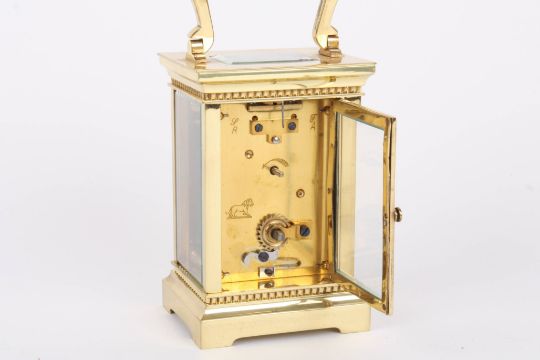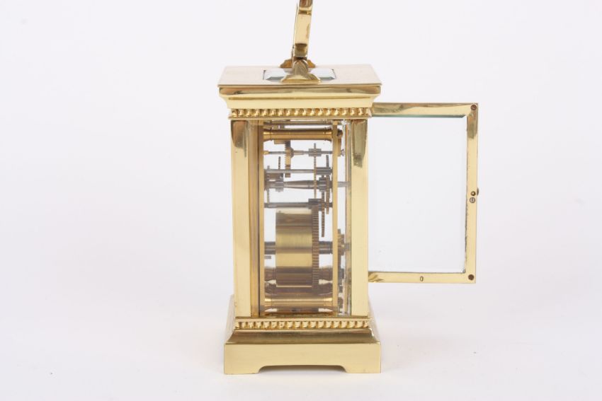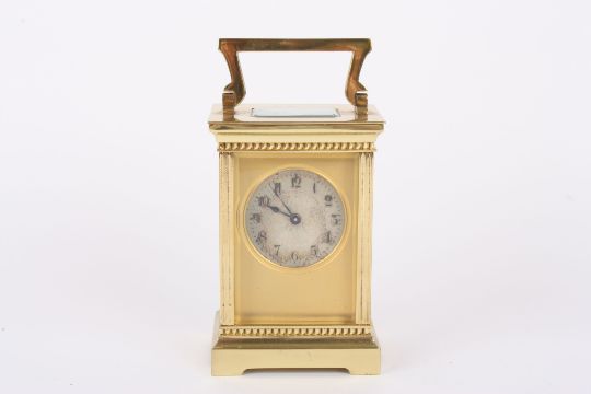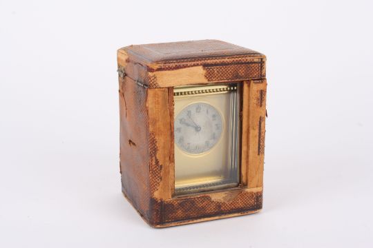 A late Victorian brass carriage clock the circular silvered engine turned dial with black Roman numerals and plain brass case, in a leather travelling case. 15 cm high incl. handle.Condition: Generally in good condition, winds, sets and runs okay, appears to keep time. Leather case fairly tired and some losses.