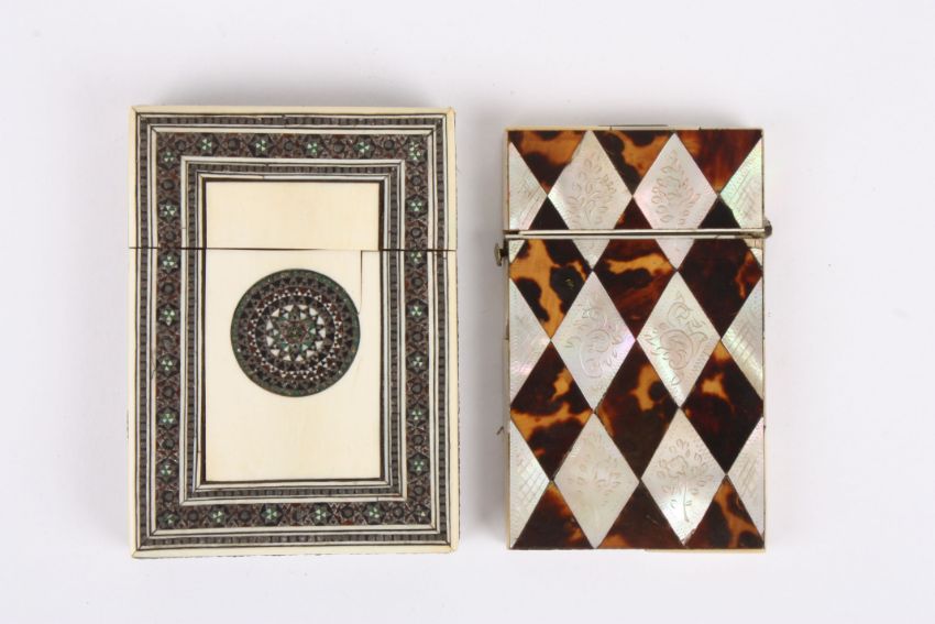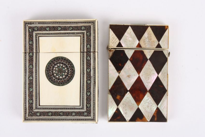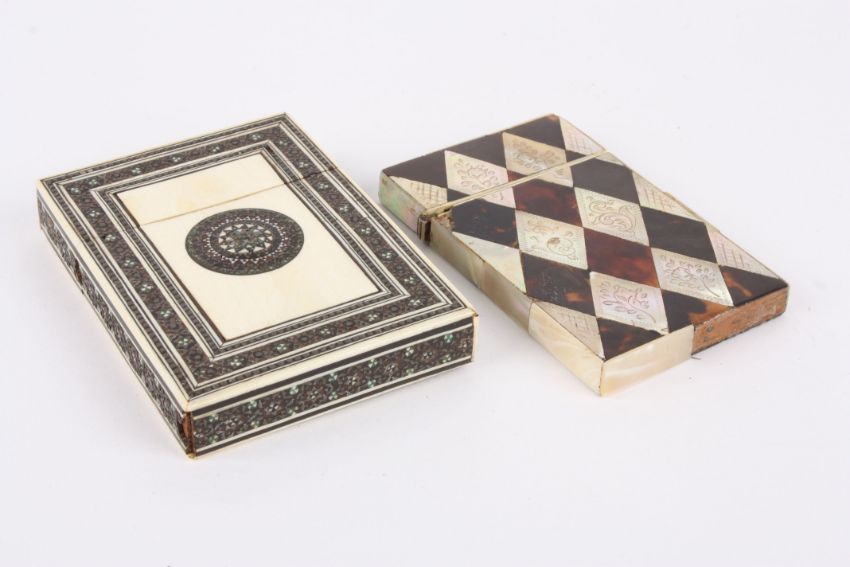 Two calling card cases one with tortoiseshell and mother of pearl inlay, the other Anglo Indian ivory. Largest 9.5 cm long.Condition: Both in poor condition with losses.