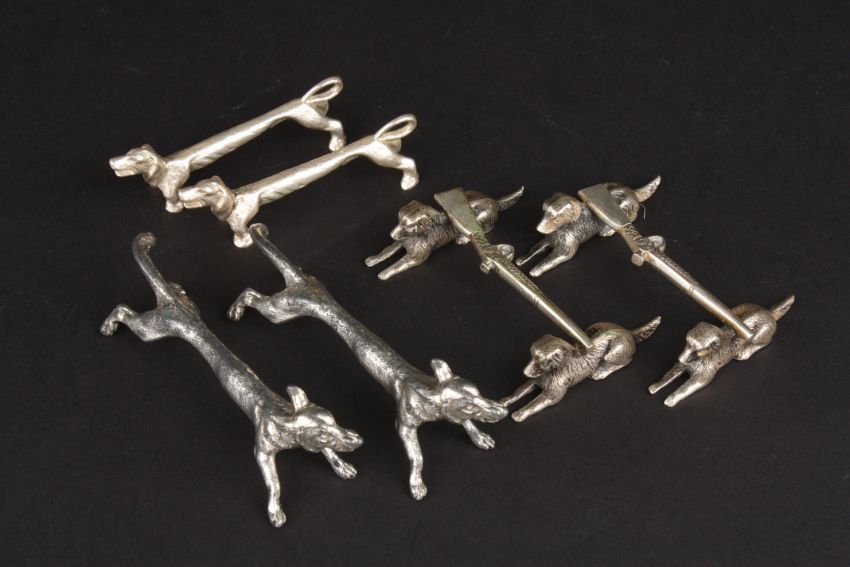 Three pairs of silver plated dog knife rests one with bar in the form of hunting guns Condition: