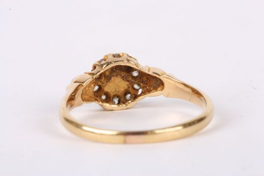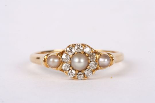 A delicate Victorian pearl and diamond cluster ring the central half pearl set within diamonds and with a single pearl to either shoulder, 18ct hallmarked mount, Birmingham 1884. Size NCondition: Overall good