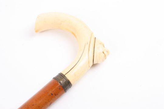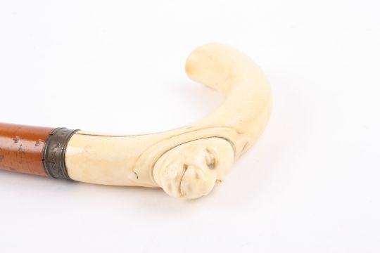 A Victorian carved ivory and malacca walking stick the handle carved with a male mask, with tapering malacca shaft. 83 cm long.Condition: Large 2 inch split to handle.