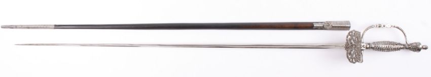 An early 20th century cut steel rapier, c.1900 the blade set with cut steel studs, the plain unmarked blade and in a leather scabbard with leather outer case. 80 cm long.Condition: Generally good condition, tip of quillon broken.