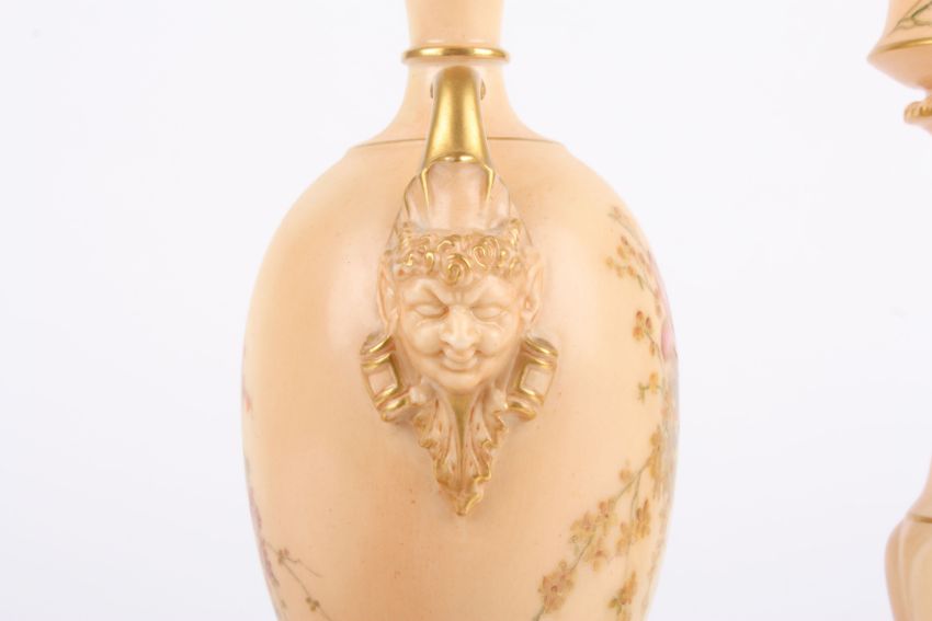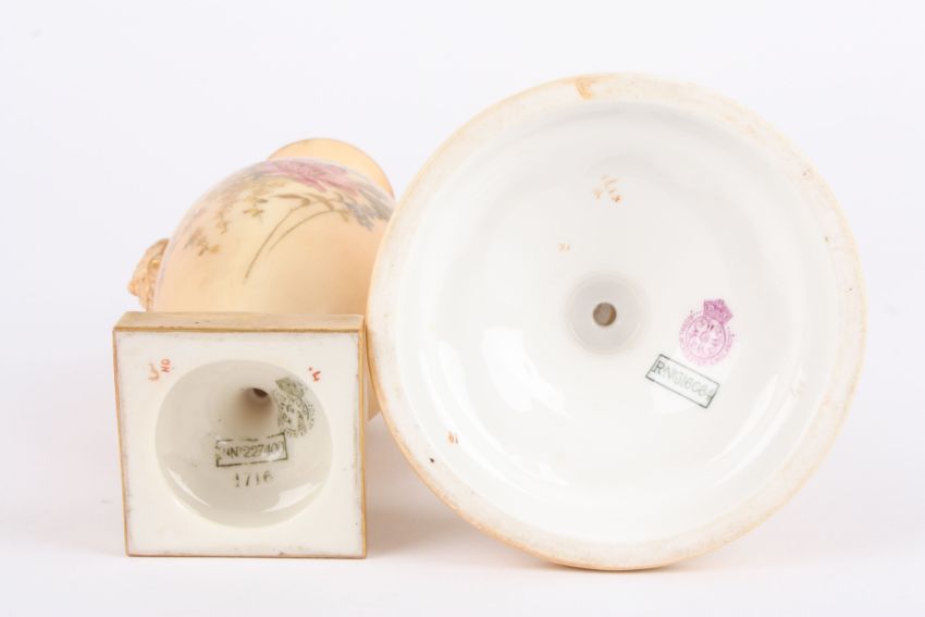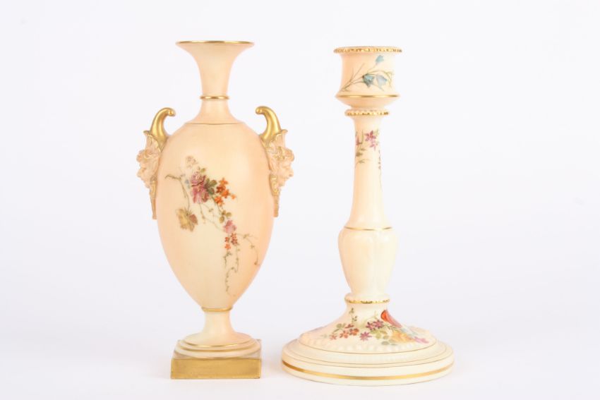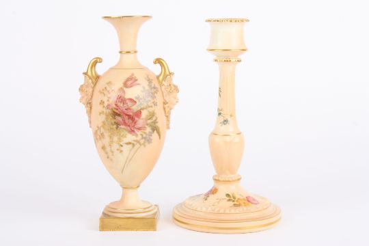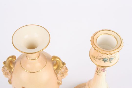 A Royal Worcester blush ivory vase with twin scrolled mask handles, together with a candlestick both decorated with flowers, the vase numbered 1716 to the base. 20 cm highCondition: Both in good overall condition although some wear to gilt from one side of the vase base.