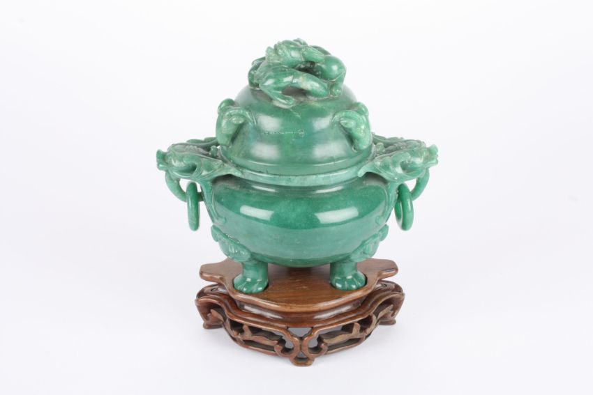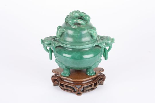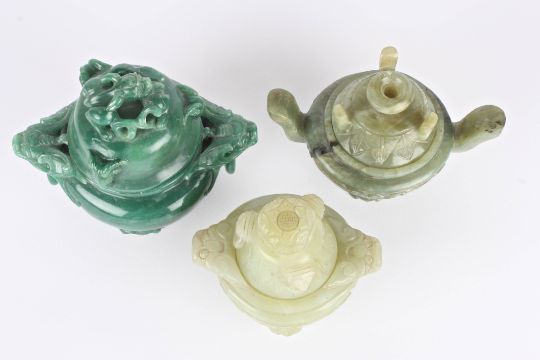 A group of three modern Chinese jade and hardstone koros and covers each with carved decoration, two with carved dogs of foe handles. One with fitted hardwood stand Largest 15.5 cm high.Condition: Largest with substantial restoration to lid