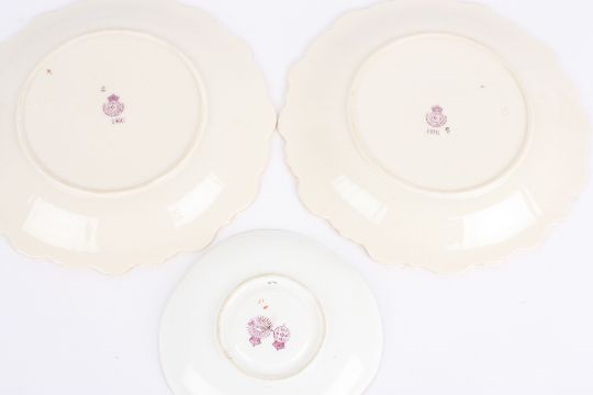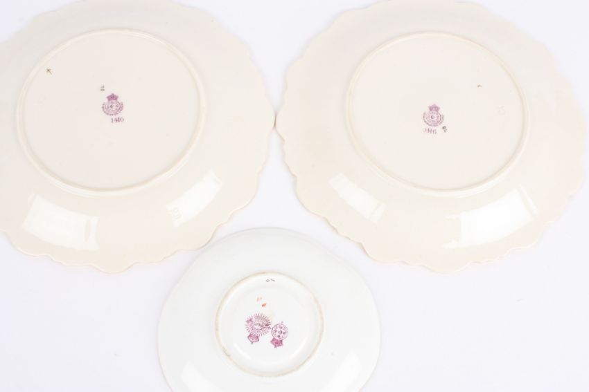 A pair of Worcester blush ivory plates with fluted rim and painted with flowers numbered 1416 together with a Worcester blush ivory saucer decorated with flowers Condition: Good overall condition although saucer has a chip to underside rim.