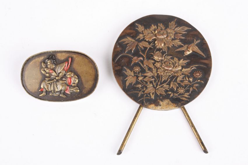 A small Japanese circular bronze plaque decorated in relief with birds and flowers, with easel mount, and an oval Japanese brooch decorated with a Samurai. (2) Larger plaque 6.25 cm diameter.Condition: Both with some wear, pin missing from brooch.