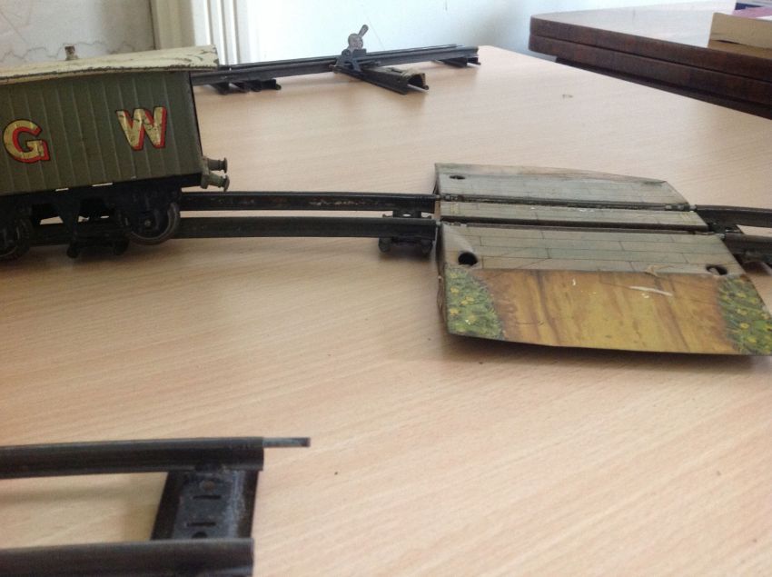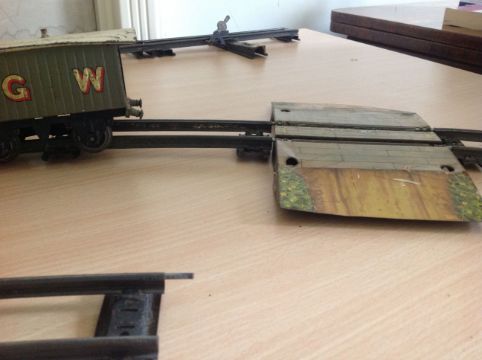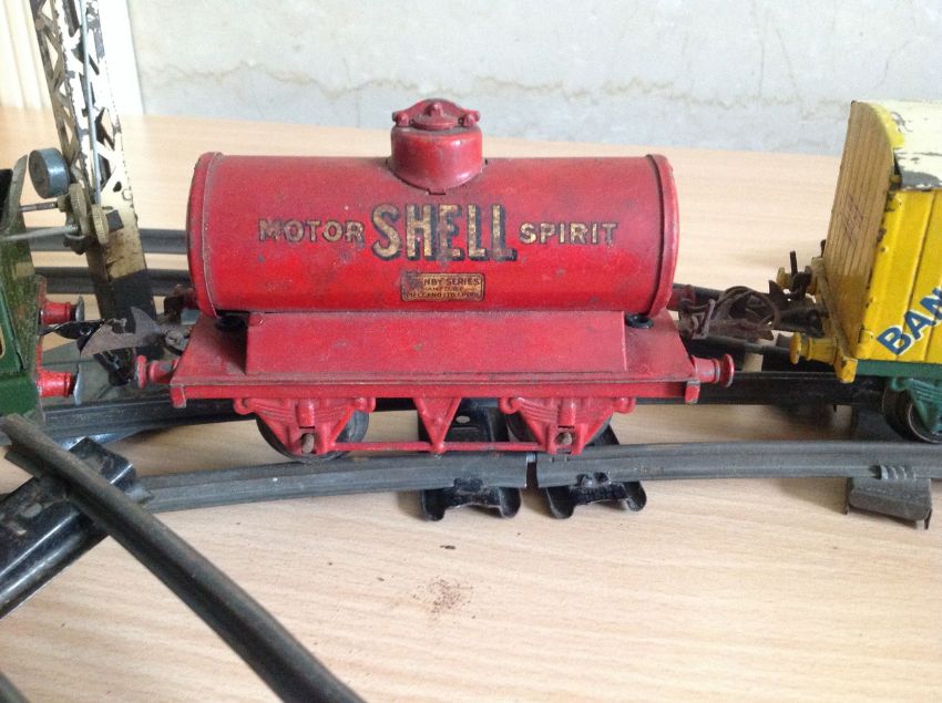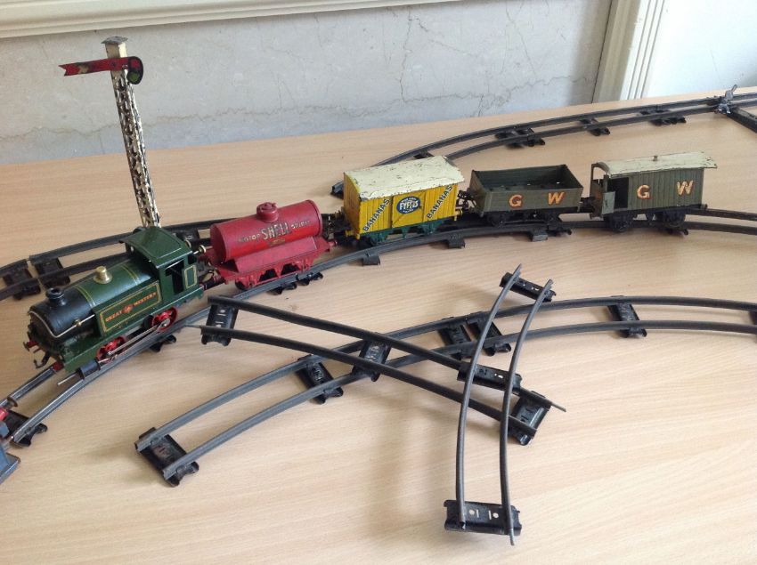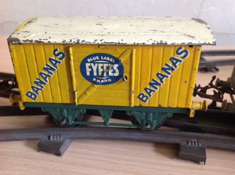 A Hornby Series '0' Gauge locomotive and a small quantity of Hornby Meccano rolling stock including Fyfes Bananas carriage, sold together with some track, a bridge and a standing signal Condition: Has been 'played' with, some rubbing, dirt and paint chipping. Some engine damage