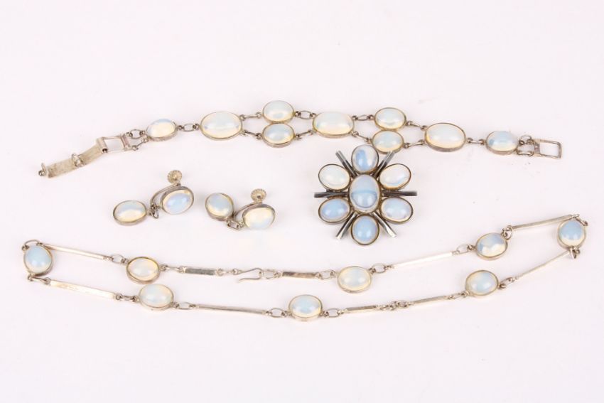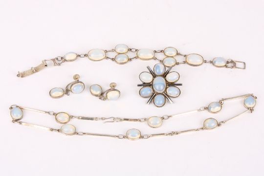 A sterling silver mounted modernist design dress bracelet, set with large 'moonstone' glass cabochons, sold together with the similar or associated white metal mounted necklace, earrings and brooch Condition: Overall good for all