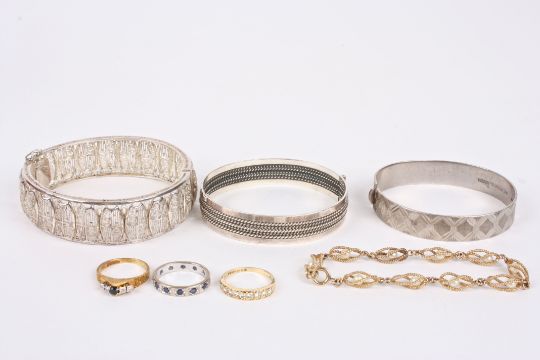 A collection of assorted jewellery including an 18ct gold and diamond half eternity ring, two other 18ct gold rings, a 9ct gold bracelet, and three silver bangles. Condition: