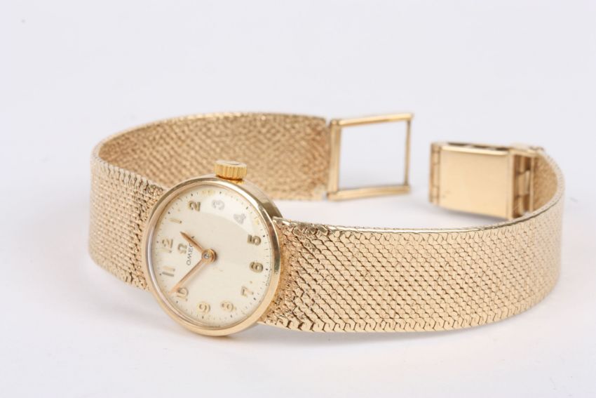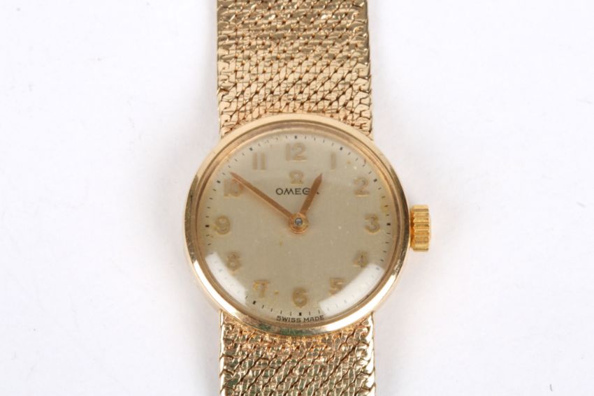 A ladies Omega 9ct gold wrist watch the circular silvered dial signed Omega and with Arabic numerals, the mechanical hand wound 620 calibre movement signed and numbered 32427444. Case number: 7115514, on a 9ct gold mesh strap. Weight without movement 24.5 grams.Condition: Appears generally in good condition and is working.