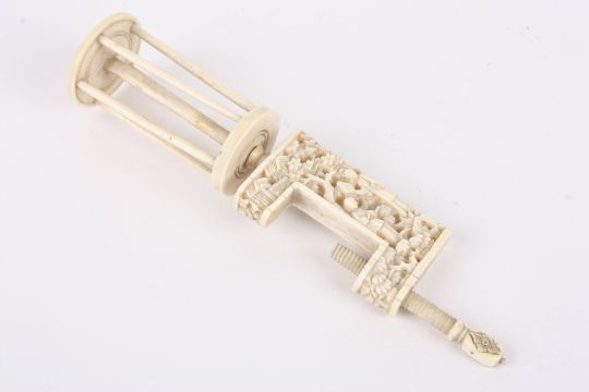 A late 19th century Chinese canton ivory bobbin clamp carved with figures, buildings and foliage. 12.5 cm long excl. screw.Condition: Generally in good condition, few splits.