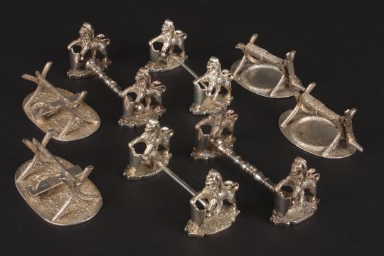 A group of four pairs of silver plated novelty knife rests comprising lions with shields, well heads and trestles. Condition: