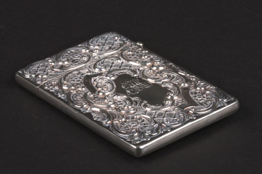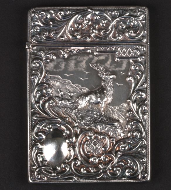 An Edwardian silver repoussé calling card case hallmarked Birmingham 1902, decorated with a highland scene of a stag and deer, surrounded by scrolls with a vacant cartouche, the reverse with engraved cartouche and further scrolls. Makers mark possibly Sydney & Co. 2 ozt.Condition: Good condition with no damage.