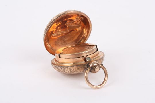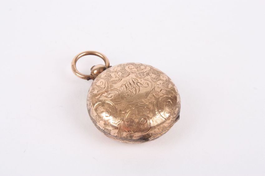 A Victorian 9ct rose gold sovereign holder hallmarked Birmingham 1892, with engraved floral decoration. 14 grams total.Condition: Crease to lid, some tarnish, otherwise reasonable condition.