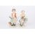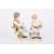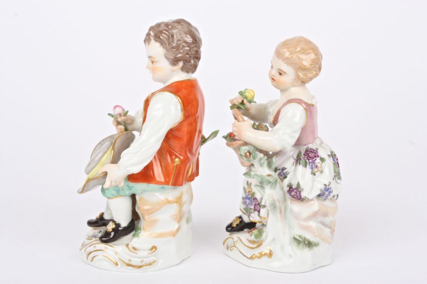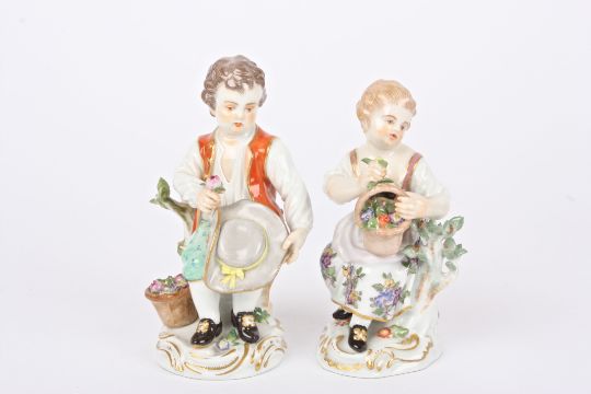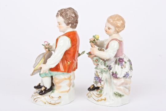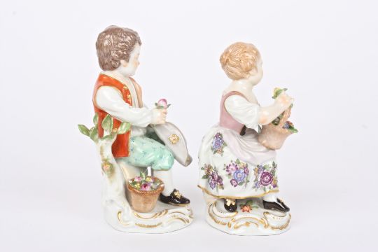 Two early 20th century German porcelain figures of a boy and girl seated holding flowers and supported on scrolled Rococo style bases, with crossed swords mark in blue to base. Boy 11.5 cm high.Condition: Handle missing to boys basket, otherwise in good condition.