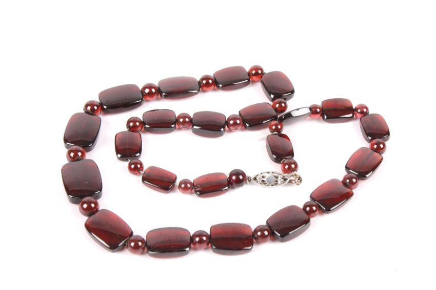 A 1930s gold and garnet necklace with 9ct white gold clasp and strung with graduated rectangular garnets. 42 cm long.Condition: Good condition, few minor minor nicks in places.