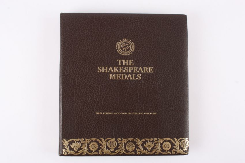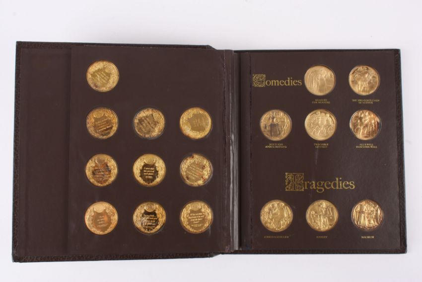 The Shakespeare Medals A set of 38 First Edition silver gilt medallions commemorating the William Shakespeare plays, in a fitted album. Produced by John Pinches Ltd. Condition: Most with some tarnish.