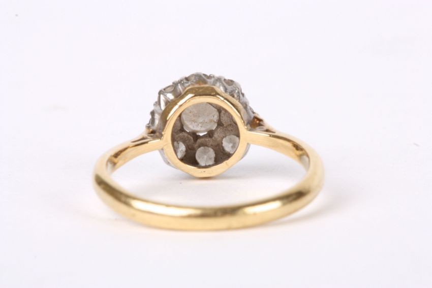 A diamond set circular cluster ring, the centre stone approx. 0.20ct and surrounded by smaller brilliant cut diamonds, mount marked 18ct Size KCondition: Mount has a flat edge wear to one side