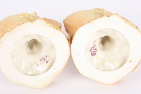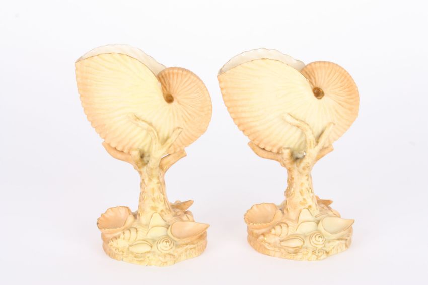 A pair of Edwardian Royal Worcester blush ivory nautilus shaped vases c.1907 naturalistically formed, the shells raised upon coral stems, the bases strewn with shells. Puce mark to base. 17 cm high.Condition: Some light gilt wear and a tiny nick to one base, but otherwise in good condition.