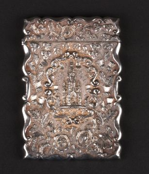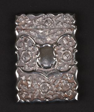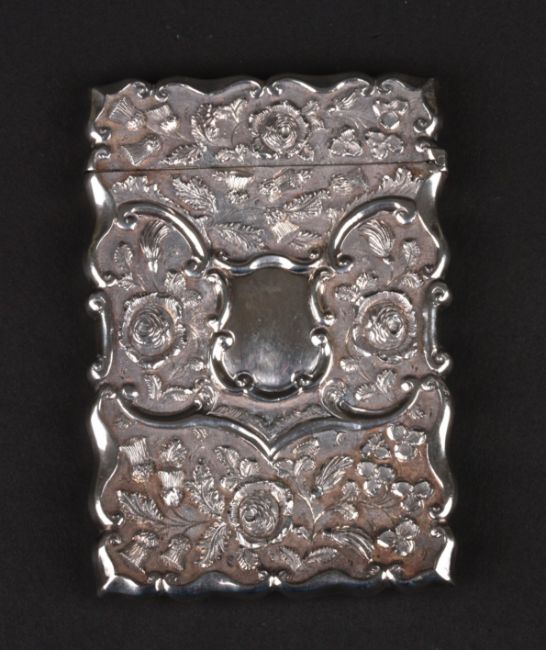 A Victorian repoussé silver 'castle top' calling card case hallmarked Birmingham 1898, decorated with a central memorial in relief, surrounded by thistles, roses and shamrocks, the reverse with vacant cartouche, scrolls and further flowers. Makers mark: Edward Turnpenny. 1.75 ozt.Condition: Generally in good condition with no damage.