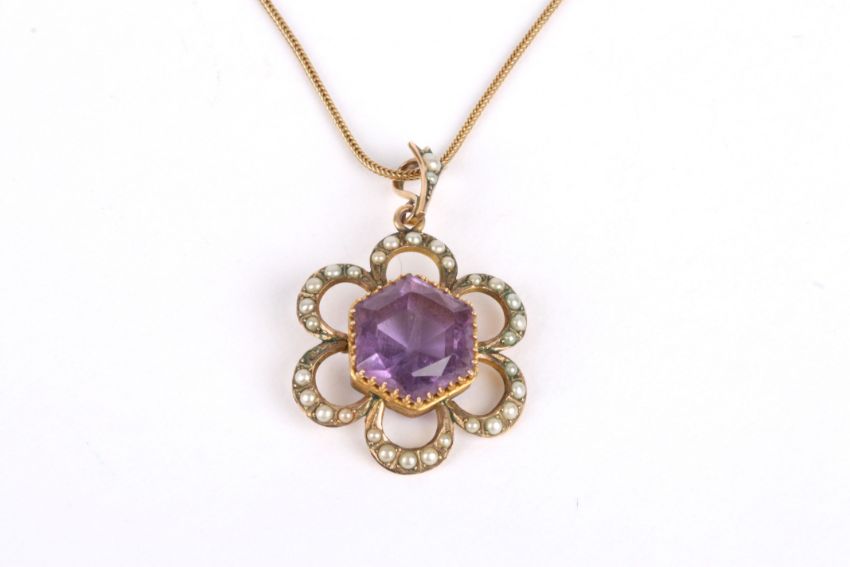An Edwardian 9ct gold amethyst and seed pearl pendant the hexagonal amethyst surrounded by seed pearls to form a flower head, with Chester hallmark, on a 9ct gold chain. 5.1 grams.Condition: Missing one seed pearl, some verdigris.