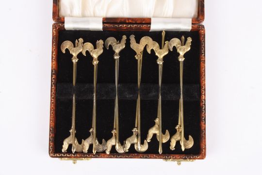 A set of 12 silver gilt cocktail sticks crested with cockerels, in a fitted case. Condition: Slight wear but good condition.