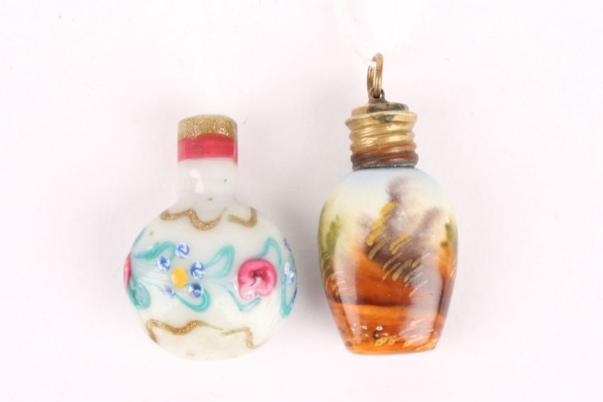Two 19th century miniature scent bottles, one ceramic painted with a scene of courting couples, the other Venetian glass with enamel flowers. (2) Largest 4cm longCondition: Both in good condition.