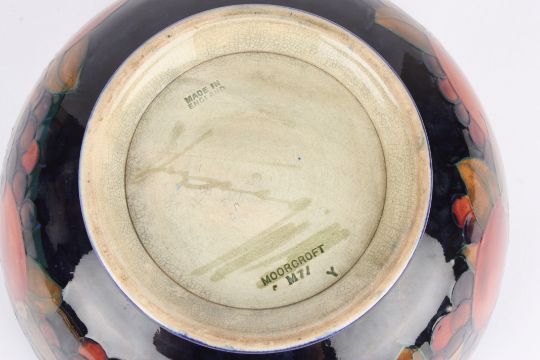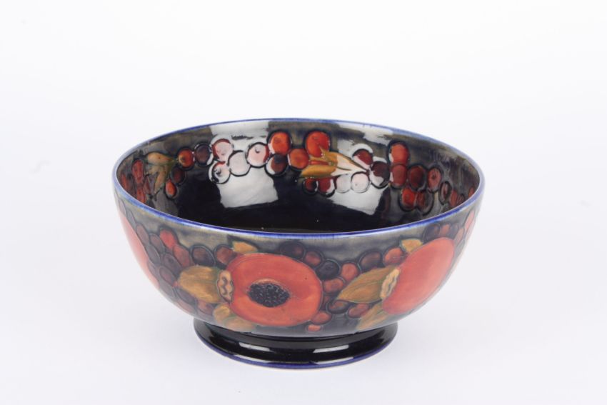 A Moorcroft Pomegranate bowl with tubelined decoration on a blue ground with impressed mark to base and signed in green. 21 cm diameter.Condition: Crazing but no damage.