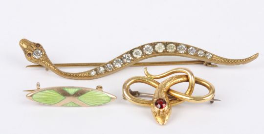 A Continental .585 gem set coiled snake brooch, a small silver and green enamel Scandinavian brooch by Marius Hammer and a gilt and paste set snake pin. (3) Respectively - 3.5 cm., 2.75 cm., 7 cm.Condition: Gold snake brooch replacement pin