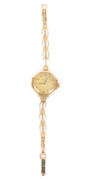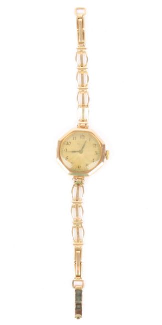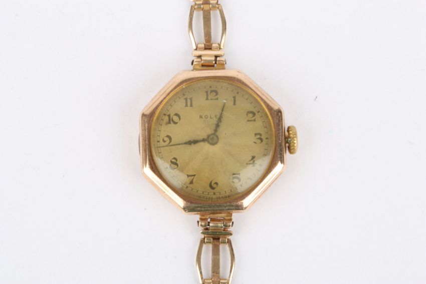 A 1920s 9ct gold ladies Rolex wrist watch the engine turned silvered dial with Arabic numerals set within an octagonal case, with hand-wound 15 jewel movement, the 9ct gold case numbered 01805. The case back with engraved initials M.A. and dated 1927, on a later rolled gold strap. 24mm diameter.Condition: In good working condition with no significant damage.