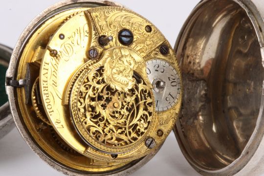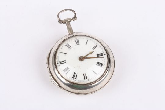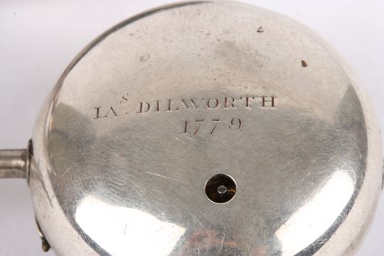 A George III silver pair cased pocket watch by Thomas Duggan of Liverpool the inner and outer cases hallmarked London 1778, case makers mark John Laithwait, the white enamel dial with black Roman numerals, the four pillar fusee movement signed and numbered 87, the inner silver case engraved 'Ja's Dilworth 1779' 36mm dial.Condition: Cracks to dial, appears in generally good condition other side, few dents and marks to outer case, movement not tested.