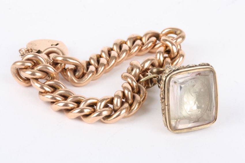 An Edwardian 9ct rose gold hollow curb link bracelet, with heart padlock fastening, padlock marked for Birmingham 1907 with attached yellow mounted carved hard stone intaglio seal fob. Condition: Overall good