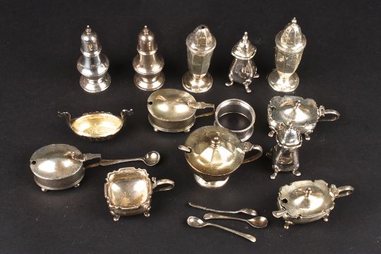 A collection of assorted silver cruets sets comprising salts, pepperettes and mustard pots, most with blue glass liners and spoons. 18.5 ozt.Condition: Generally good condition, some wear.